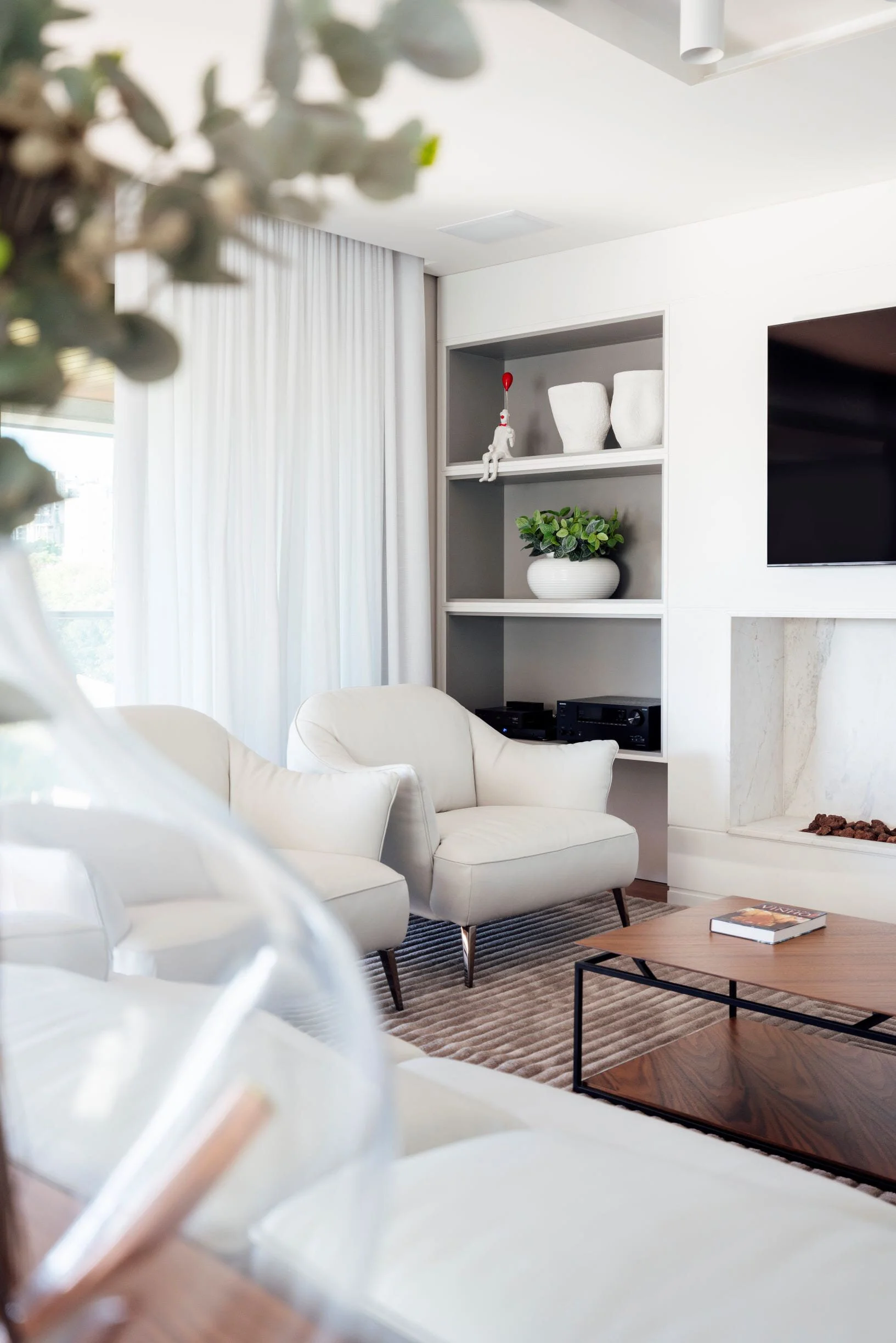 Iniciamos as intervenções deste apartamento de 256,50 m² localizada no bairro Moinhos de Vento, em frente ao parcão, em Porto Alegre, ainda em fase de projeto. Tivemos a oportunidade de alterar alguns pontos que eram importantes para os nossos clientes, como ter mais espaço no ambiente da churrasqueira, e transformamos duas suítes em uma suíte master, com dois closets e dois banheiros. Este projeto tem como base os tons de branco, madeira natural Cumaru em todo piso, com exceção da cozinha e banheiros, e os painéis de lâmina de madeira natural Carvalho Americano. Linhas retas, cores sóbrias, para um projeto elegante e atemporal. Os toques de cor se dão em detalhes, como as poltronas em veludo verde, voltadas para varanda e as obras de arte.